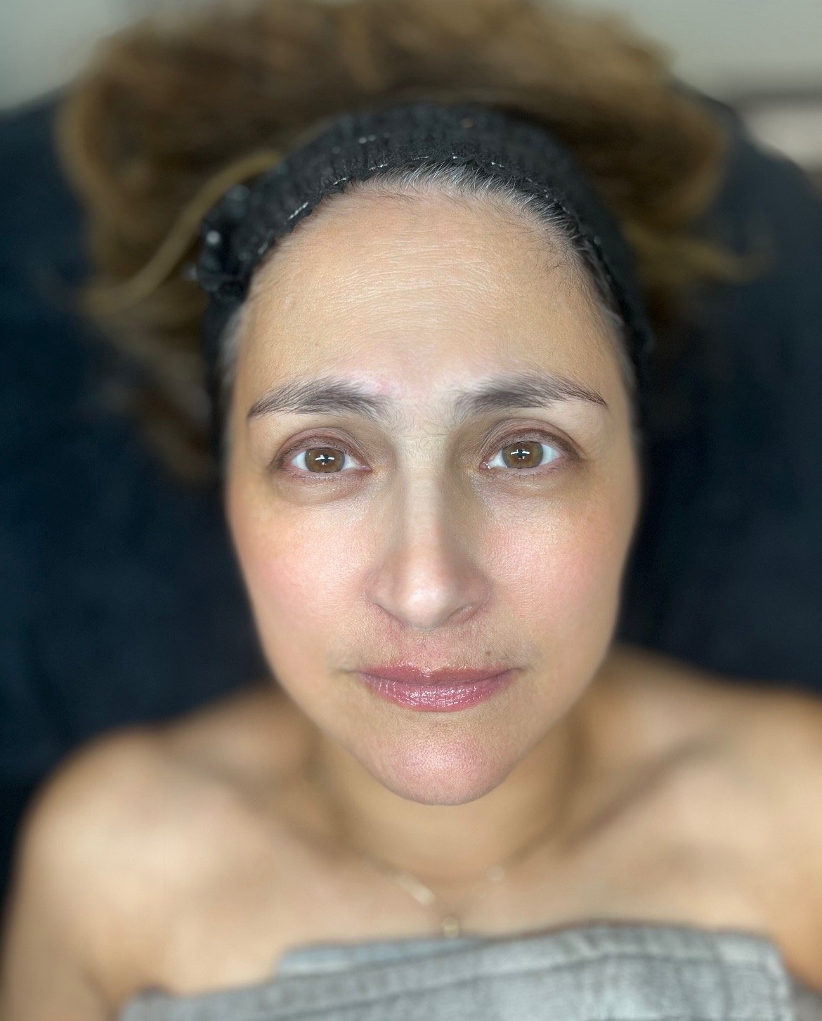 A woman lying down with her eyes closed, receiving an injection in her forehead from a person wearing black gloves. The woman has long, wavy hair and is wearing a headband, a gold watch, and bracelets.