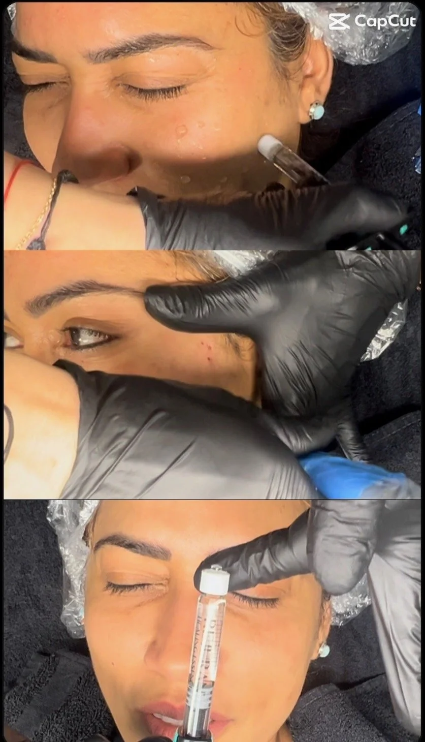 A woman receives a cosmetic injection procedure, with three close-up shots showing her face and the medical professional administering the injection.